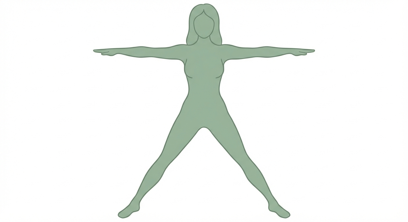 Debout, les jambes écartées, les bras levés en V, paumes ouvertes, le corps rayonne dans toutes les directions.