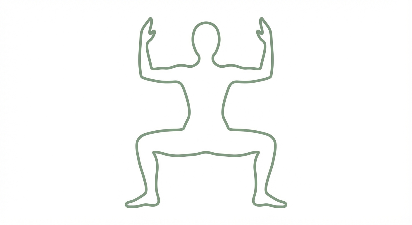 Debout, les jambes écartées, les genoux pliés à 90°, les bras levés à angle droit, paumes ouvertes.