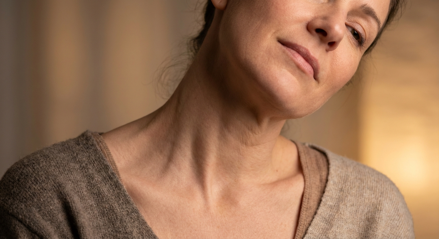Side neck stretch : assis, vous inclinez votre tête vers la droite. Vous pouvez aider avec une légère pression de la main droite sur la tête (pas sur le cou). Maintenez 20 à 30 secondes de chaque côté. Respirez profondément. Répétez 2 à 3 fois. Vous devez sentir un étirement doux, pas une douleur.